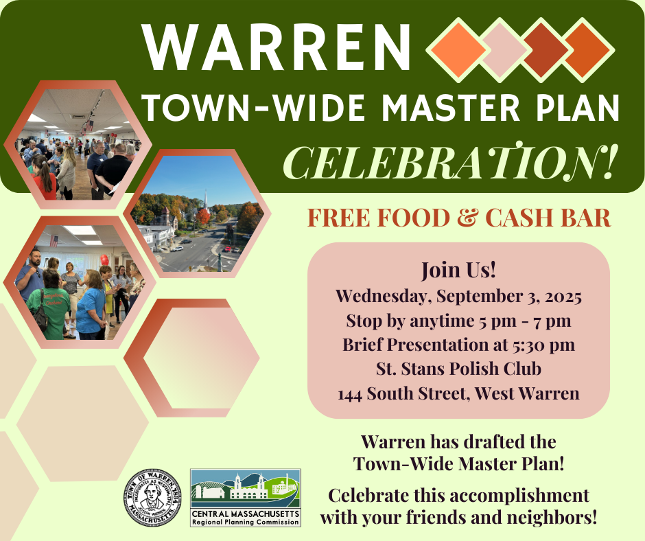 Warren just drafted its Town-Wide Master Plan, which will inform municipal policies and investments for the next 10 years! Celebrate this incredible accomplishment, join us for free food and a cash bar at the Pavilion at St. Stans Polish Club!